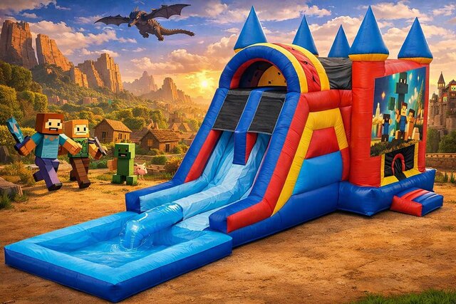 Blast into the world of Minecraft with this epic bounce house & dual waterslide that brings the video game to life! This massive inflatable is perfect for your next Minecraft-themed birthday party or backyard bash.
