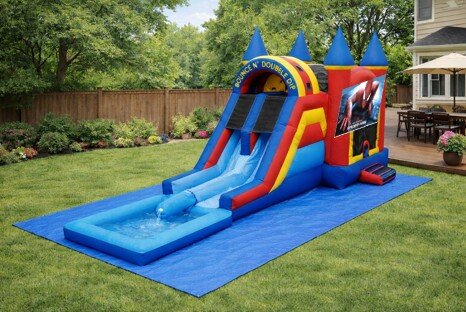 Spiderman is here to bring hours of excitement and fun to your child’s birthday party. Let your child’s imagination run wild and let them pretend they are a super hero on their big day as they play alongside the most famous super heroes of all time.The graphics will wow and impress anyone within eyesight. The Spiderman Combo is a perfect way to incorporate both fitness and fun in one and what makes it even better is that everyone will end the day extremely happy. This isn’t just any ordinary bounce house, besides the large bounce area that fits up to 8 kids at once and dual slides, so boredom will never be an issue with this at your next party! The Spiderman Bounce and Waterslide Combo will turn any birthday party, family reunion, church fair, school festival, or business opening into a super good time!